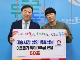 울산 동구 대송시장에서 식품유통업체를 운영하고 있는 new캐슬장터 박효식 대표가 1월 28일 오전 11시 10분 동구청을 방문해 시가 200만원 상당의 쌀(10kg) 50포를 전달했다.박효식 대표는 평소 시장을 찾