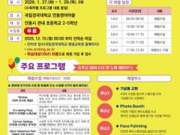안동시는 오는 2026년 1월 27일부터 29일까지 국립경국대학교에 내 안동영어마을에서 운영하는 겨울방학 특별프로그램 'AEV (Andong English Village) English Fair'의 참가 학생을 선착순 으로 모집한다고