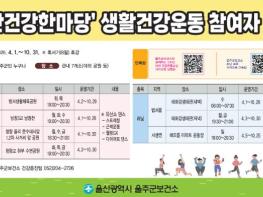 울주군보건소가 다음달 1일부터 오는 10월 31일까지 ‘울산 건강 한마당’ 생활 건강운동 교실을 운영한다고 23일 밝혔다.이번 사업은 광장과 공원 등 야외공간을 활용한 생활밀착형 운동프로그램으로, 울주