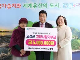 고성군은 12월 5일, 재부산고성향우회 김계자 자문위원이 고향사랑기부금 500만 원을 기탁했다고 밝혔다.작년에 이어 올해에도 고향사랑기부금을 통해 선행을 이어온 김계자 자문위원은 “고성군에 도움을