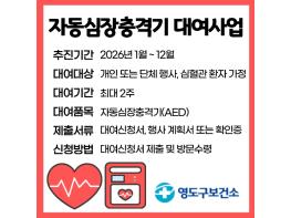 영도구보건소(소장 박성률)는 급성 심장정지 등 응급 사고 발생 시 구민의 생명을 보호하고 골든타임을 확보하기 위해 ‘2026년 이동형 자동심장충격기(AED) 무상 대여 사업’을 시행한다.이번 사업은 각종