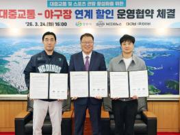 창원특례시와 NC 다이노스, ㈜마이비는 24일 창원시청에서 시내버스-야구장 연계 할인 서비스 제공을 위한 업무협약을 체결했다. 이날 협약식에는 창원시장 권한대행, 이진만 NC 다이노스 대표이사, ㈜마이