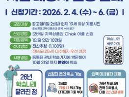 충남 계룡시는 2026년 학습나래 사업을 본격 시작한다고 밝혔다.올해 학습나래 사업은 공고일(1월 26일) 현재 19세 이상 계룡시민을 대상으로, 1인당 연간 10만 원의 평생학습 지원금을 총 1,100명에게 지급