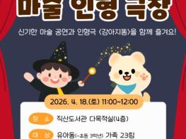 천안시 직산도서관은 내달 ‘도서관 속 문화정원’을 운영한다고 20일 밝혔다. 도서관 속 문화정원은 지역주민의 문화 향유 기회를 확대하기 위해 마련됐으며, 첫 공연으로 ‘알쏭달쏭 마술 인형 극장’을