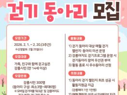 강릉시보건소는 시민들의 건강 걷기 참여를 확대하고 걷기 생활화를 정착시키기 위해 ‘2026 행복 가득, 건강 가득’ 강릉시 걷기 동아리 참가자를 오는 2월 1일부터 2월 20일까지 모집한다. 이번 걷기 동아