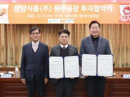 원주시는 10일 오후 1시 30분, 시청 7층 투자상담실에서 지역의 대표 향토기업인 삼양식품㈜와 액상스프 공장 신설 투자를 위한 협약(MOU)을 체결했다. 협약식에는 원강수 시장을 비롯해 김동찬 삼양식품㈜