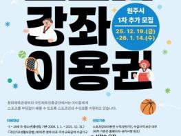 원주시는 1월 14일까지 2026년 스포츠강좌이용권 이용자를 추가 모집한다. ※ 예산 상황에 따라 조기 종료될 수 있음.문화체육관광부와 국민체육진흥공단은 저소득층 유·청소년을 대상으로 스포츠 향유 기회