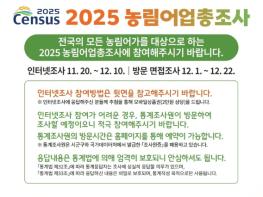 강릉시는 11월 20일 목요일부터 오는 12월 22일 월요일까지 '2025 농림어업총조사'를 실시한다. 농림어업총조사는 5년 주기로 농가, 임가, 어가의 규모와 지역별 분포, 경영형태 파악하는 국가 기본통계조