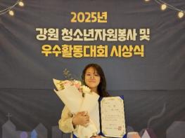 영월군청소년문화의집봉사동아리 소속 이가윤(무릉초6)이 지난 14일 ‘2025년 강원 청소년자원봉사 및 우수활동대회’ 시상식에서 한국청소년활동진흥원 이사장상을 받았다. 올해 문화의집 봉사동아리 ‘봉