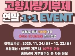 홍천군은 연말을 맞아 고향사랑기부제 참여 활성화를 위해 11월 24일부터 12월 22일까지 4주간 ‘고향사랑기부제 연말 1+1 이벤트’를 운영한다.이벤트 기간 동안 홍천군에 10만 원 이상을 기부한 사람은 별