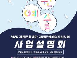 강원문화재단은 2026년 강원문화예술지원사업의 주요 내용과 변경사항을 도민에게 안내하기 위해 춘천·원주·강릉 등 3개 권역에서 총 4회에 걸쳐 통합 사업설명회를 개최한다. 이번 설명회는 강원문화재단의