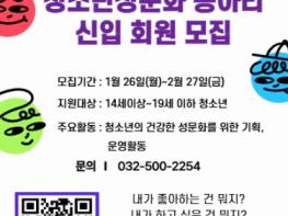 부평구청소년성문화센터는 다음 달 27일까지 ‘2026년 청소년성문화 동아리’ 신입 회원을 모집한다고 밝혔다.청소년성문화 동아리는 14세 이상 19세 이하 청소년을 대상으로 운영되며, 성인지 감수성을 바