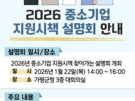 가평군이 관내 중소기업의 경영 안정과 경쟁력 강화를 위해 새해 정부의 지원시책을 한자리에 모아 안내하는 설명회를 연다.가평군은 관내 중소기업을 대상으로 ‘2026년 중소기업 지원시책 설명회’를 오는