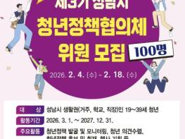 성남시는 오는 2월 18일까지 ‘제3기 청년정책협의체’ 위원 100명을 공개 모집한다.청년정책협의체는 지역 청년을 대표해 성남시에 청년정책을 제안하고 소통하는 청년 참여기구다.제3기 협의체는 일자리·
