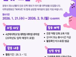 광명시청소년재단 청소년진로진학지원센터는 관내 중·고등학교 청소년 대상 학과 멘토링 운영을 위해 ‘2026년 대학생 멘토단(wave)’을 모집한다고 밝혔다.대학생 멘토단(wave)은 대학생 멘토가 전공 및 진