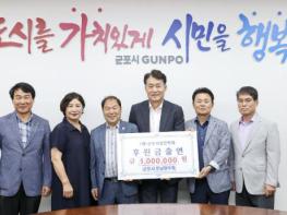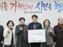 군포시는 지난 9일, 안양·군포·의왕·과천 지역에서 활동하는 건축사 모임인 안양지역건축사회로 부터 현금 100만원을 기탁받았다.안양지역건축사회는 180여명의 회원이 있으며 기금을 마련하여 연말이면 군