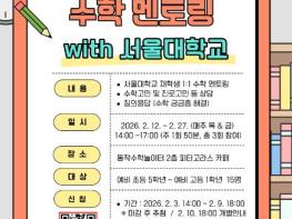 동작구가 동작수학놀이터에서 진행하는 ▲서울대생 1:1 수학 멘토링과 ▲수능수학 완전정복 프로그램 참여자를 모집한다고 밝혔다.동작수학놀이터 수학 멘토링은 지난 1월에 이어 2차로 운영하며, 관내 예비