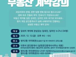 서울 송파구는 방이2동 자치회관에서 오는 12월 12일 오후 4시부터 6시까지 '알아두면 든든한 부동산 임대차 계약 강의'를 개최한다.이번 강의는 청년 1인 세대 전·출입이 잦은 방이2동 지역 특성을 반영해