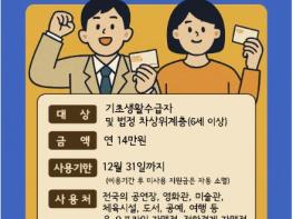 서울 서초구는 2025년도 문화누리카드의 사용 기간이 올해 12월 31일로 마감된다고 밝혔다.문화누리카드는 6세 이상의 기초생활수급자와 차상위 계층의 문화·여가 활동을 지원하기 위해 정부가 지급하는 연