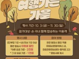 마포구가 후원하고 마포구시설관리공단이 주최, 주관하는 마포순환열차버스 프로모션 행사 ‘엄빠랑 여행가는 가을’이 11월 30일까지 운영된다.이번 행사는 문화체육관광부가 추진하는 범국민 여행 활성화