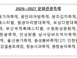 문화체육관광부는 ‘2026~2027 문화관광축제’로 27개를 최종 선정해 발표했다. 이 중 20개는 기존 ‘2024~2025 문화관광축제’ 중에서 재지정한 것이며, 최근 청년세대와 가족 단위 관광객에게 큰 인기를