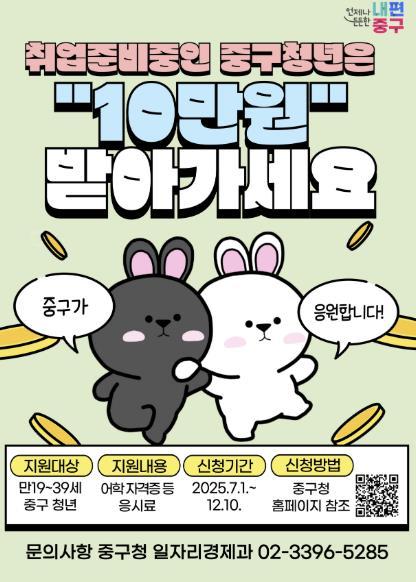 지원 대상은 중구에 주민등록을 두고 있는 만 19세~39세의 미취업 청년이다. 단, 사업자등록이 없어야 하며, 주 30시간 이하 또는 3개월 이하의 단기근로자와 정부 직접일자리 사업 참여자는 예외적으로 지원받을 수 있다.