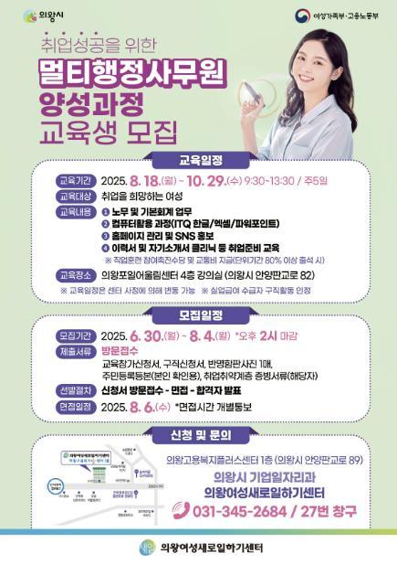 [한국제일신문, 심태선기자] 의왕시 여성새로일하기센터는 취업 희망 여성들을 대상으로 하는‘멀티행정사무원 양성과정’의 교육생을 모집한다.