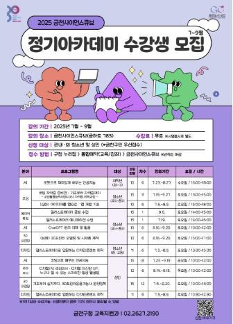 [한국제일신문, 김성옥기자] 금천구는 7월부터 9월까지 청소년과 주민을 위한 '금천사이언스큐브 정기 아카데미'를 개강한다고 밝혔다.