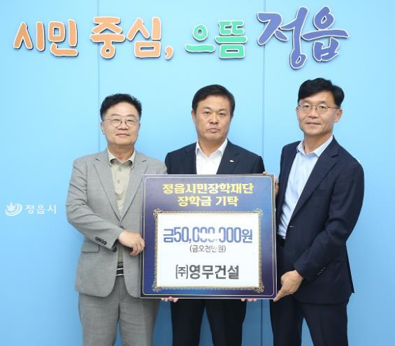 [한국제일신문, 이미란기자] 중견 건설사 ㈜영무건설이 정읍의 미래 인재 양성을 위해 정읍시민장학재단에 5000만원의 장학금을 기탁하며 지역 상생 의지를 밝혔다.
