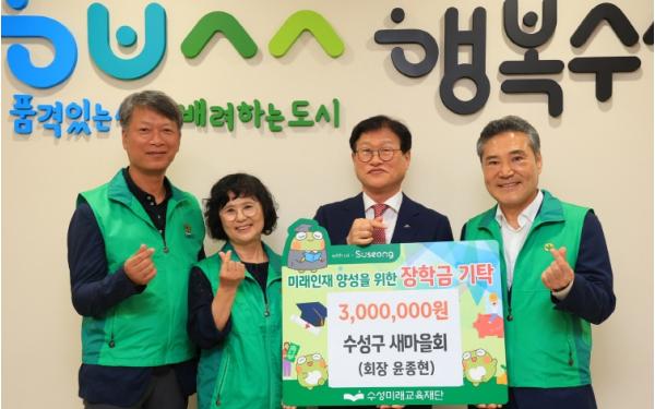 수성구새마을회(회장 윤종현)는 지난 2일 미래인재 육성과 지역 교육경쟁력 강화를 위해 장학금 300만 원을 수성미래교육재단에 기탁했다.