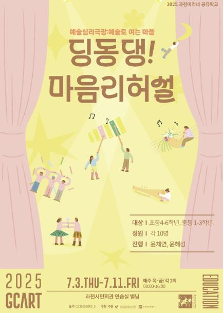 [한국제일신문, 김성옥기자] 경기도안양과천교육지원청이 7월3일부터 7월11일까지 과천문화재단과 함께하는 학교 생활 적응을 위한 수업위탁형 마음인성공유학교 ‘딩동댕, 마음리허설’프로그램을 초, 중등 대상 2회에 걸쳐 운영한다.이 프로그램은 심리적, 환경적 요인 등으로 소속 학교에서 운영하기 어려운 개별 맞춤 교육활동이 필요한 초등학교 3학년부터 중학교 3학년 학생 20명을 대상으로 교우관계 개선과 자존감 회복을 위해 기획했다. 사전에 담임교사가 제출한 학생 이해자료를 바탕으로 학생의 어려움을 분석하여 심리 정서 회복에 도움이 되는 문화예술 프로그램으로 설계했다.