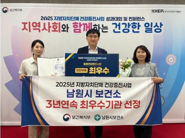 [한국제일신문, 이미란기자] 남원시가 보건복지부가 주관한 2025년 통합건강증진사업 성과 평가에서 3년 연속 ‘종합부문 최우수 기관’으로 선정되는 쾌거를 이뤘다.