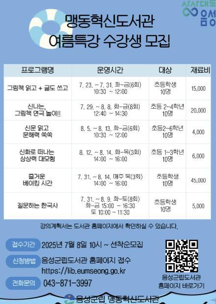 사회 맹동혁신도서관, '여름특강 문화교실' 수강생 모집