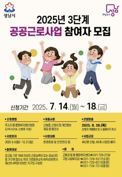 [한국제일신문, 김성옥기자] 성남시는 오는 7월 14일부터 18일까지 ‘2025년도 3단계 공공근로사업’ 참여 희망자 462명을 모집한다.