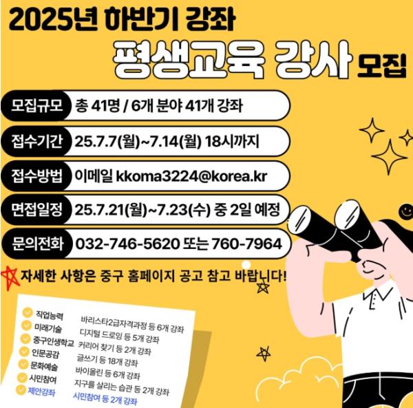 [한국제일신문, 김성옥기자] 인천시 중구는 ‘2025년 중구 평생학습관 하반기 정규 프로그램’에 함께할 강사를 공개 모집한다고 4일 밝혔다.