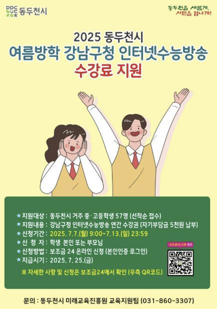 ‘강남구청 인터넷 수능방송’은 강남구청이 운영하는 온라인 학습 플랫폼으로, 중·고등학교 내신과 수능 대비 전 과정을 다루는 고품질 강의를 제공하고 있다. 동두천시는 수강료 4만 원을 지원하며, 학생들은 자기부담금 5천 원만으로 해당 강의를 수강할 수 있다.