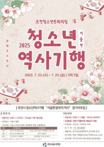 (재)포천시청소년재단 포천청소년문화의집은 광복 80주년을 맞아 서울 주요 역사ž문화 명소를 탐방하는 ‘청소년 역사기행(서울편)’ 프로그램을 오는 7월 23일부터 25일까지 운영한다.