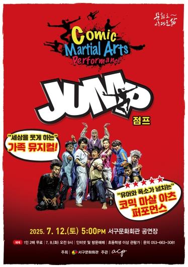 [한국제일신문, 김성옥기자] 서구문화회관은 오는 7월 9일부터 12일까지 서구문화회관 공연장에서 코믹 마샬아츠 퍼포먼스‘점프’공연을 무대에 올린다.