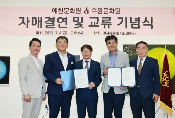 예천문화원(원장 조윤)과 수원문화원(원장 김봉식)은 4일, 예천군문화회관 1층 갤러리에서 자매결연식을 개최하고 양 지역 간 지속적인 문화교류와 협력 강화를 위한 MOU를 체결했다.