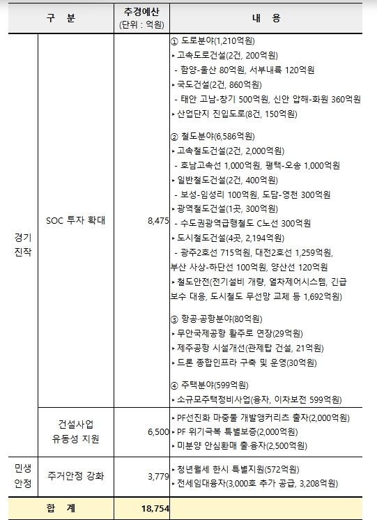 이번 추경예산에는 신규 건설투자 감소 및 유동성 부족으로 어려움을 겪고 있는 건설업계의 활력을 돋우고, 서민의 주거비를 경감하기 위해 필요한 국토부 소관 1조 8,754억원의 신규 세출예산이 반영됐다.