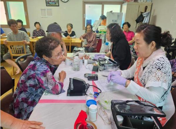 교육을 진행하기에 앞서 보건소 방문간호사가 어르신들의 혈압, 혈당, 콜레스테롤, 빈혈을 측정해 본인의 건강상태를 정확히 인지하고 관리할 수 있도록 개별상담 후 참석자에게 부채도 배부했다.