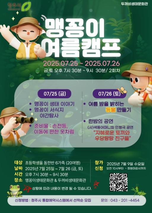 [한국제일신문, 김성옥기자] 청주시는 여름방학을 맞아 오는 25일과 26일 이틀에 걸쳐 두꺼비생태문화관에서 양서류 야간 탐사 활동 ‘맹꽁이 여름 캠프’를 운영한다고 8일 밝혔다.