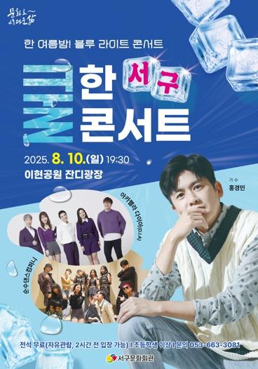 [한국제일신문, 김성옥기자] 서구문화회관은 8월 10일 오후 7시 30분 이현공원 잔디광장에서 시원한 음악으로 무더위를 식혀줄'서구! 쿨(Cool)한 콘서트'를 개최한다.