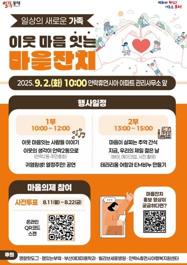 한편, 이번 주민총회는 단순한 마을의제 결정을 위한 회의를 넘어, 주민과 함께하는 마을잔치로 마련된다. 총회 당일인 9월 2일에는 ▲풍성한 체험 부스와 다양한 먹거리 부스 ▲주민자치회 프로그램 수강생과 어린이집 원생들의 공연 ▲찾아가는 복지상담 및 건강 체크 등 다채로운 즐길거리와 실질적인 행정·복지 서비스가 함께 제공될 예정이다.