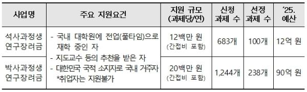 특히 올해는 '석사과정생 연구장려금'을 처음으로 신설하여 석사 단계부터 체계적인 지원을 통해 인문사회 분야 대학원생의 학업단절을 예방하고 연구 몰입 환경을 구축하고자 한다. 선발된 100명에게는 1인당 연간 1,200만 원을 지원하여 우수연구자로 성장할 수 있는 기반을 마련했다.