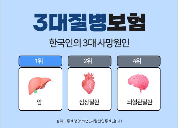 [한국제일신문, 김성옥기자] 흔히 3대질병이라 일컫는 암, 심혈관질환, 뇌혈관질환은 통계청 발표자료에 따르면 한국인의 주요 사망원인 중에서 3위 폐렴을 제외하고 1~4위를 차지하고 있으며, 이전부터 지금까지도 살면서 가장 먼저 대비해야 하는 치명적인 질병으로 강조되고 있다. 이러한 중대질병에 대비하기 위하여 상기 세가지 치명적인 질병을 집중보장하는 3대질병진단비보험을 많이 가입하고 있다. 3대진단비보험은 각각의 질병을 중점적으로 보장하면서도 가입자 특성에 맞는 특약을 추가함으로써 종합건강보험으로도 활용할 수가 있다.