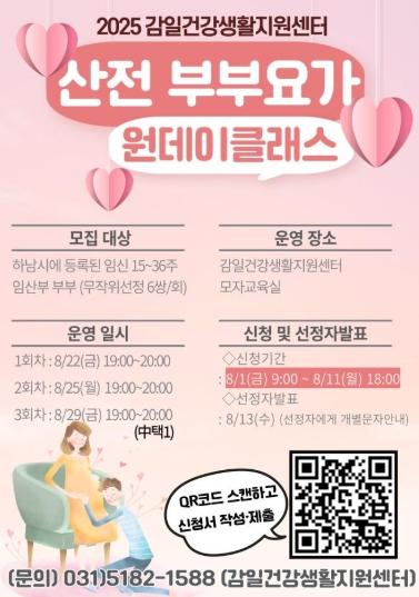 [한국제일신문, 김성옥기자] 하남시가 예비 엄마와 아빠가 함께 마음을 맞추고 출산을 준비할 수 있는 특별한 시간을 마련한다. 하남시 보건소 감일건강생활지원센터는 오는 8월 22일, 25일, 29일 저녁 7시부터 8시까지 총 3회에 걸쳐 부부대상 『산전 부부요가 원데이 클래스』를 운영한다고 밝혔다.