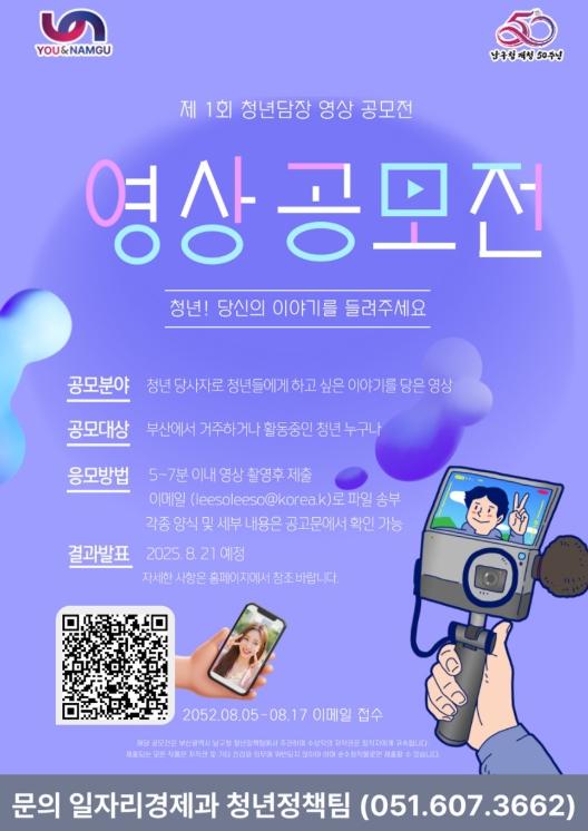 [한국제일신문, 김성옥기자] 부산 남구는 개청 50주년을 맞아 청년들의 삶과 목소리를 공유하는 이야기 프로젝트 ‘청년담(談)장’을 운영하며, 여기에서 펼쳐질 청년들의 이야기 영상을 8월 17일까지 모집한다고 밝혔다.