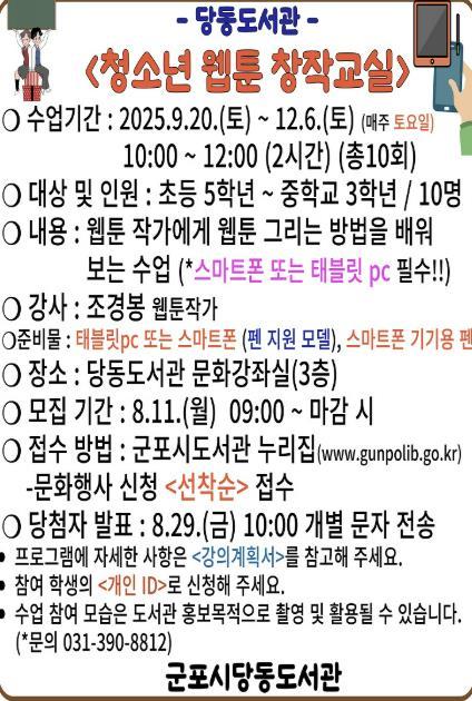 [한국제일신문, 김성옥기자] 군포시 당동도서관은 청소년을 대상으로 9월 20일부터 12월 6일까지 매주 토요일 10~12시, 총 10회에 걸쳐 '청소년 웹툰 창작교실'을 운영한다.