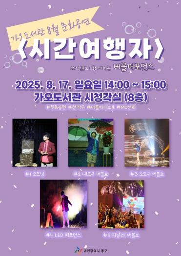 [한국제일신문, 김성옥기자] 대전 동구는 오는 17일 오후 2시 가오도서관 시청각실에서 여름방학을 맞은 어린이와 지역 주민을 위한 문화공연 버블퍼포먼스 ‘시간여행자’를 개최한다고 7일 밝혔다.